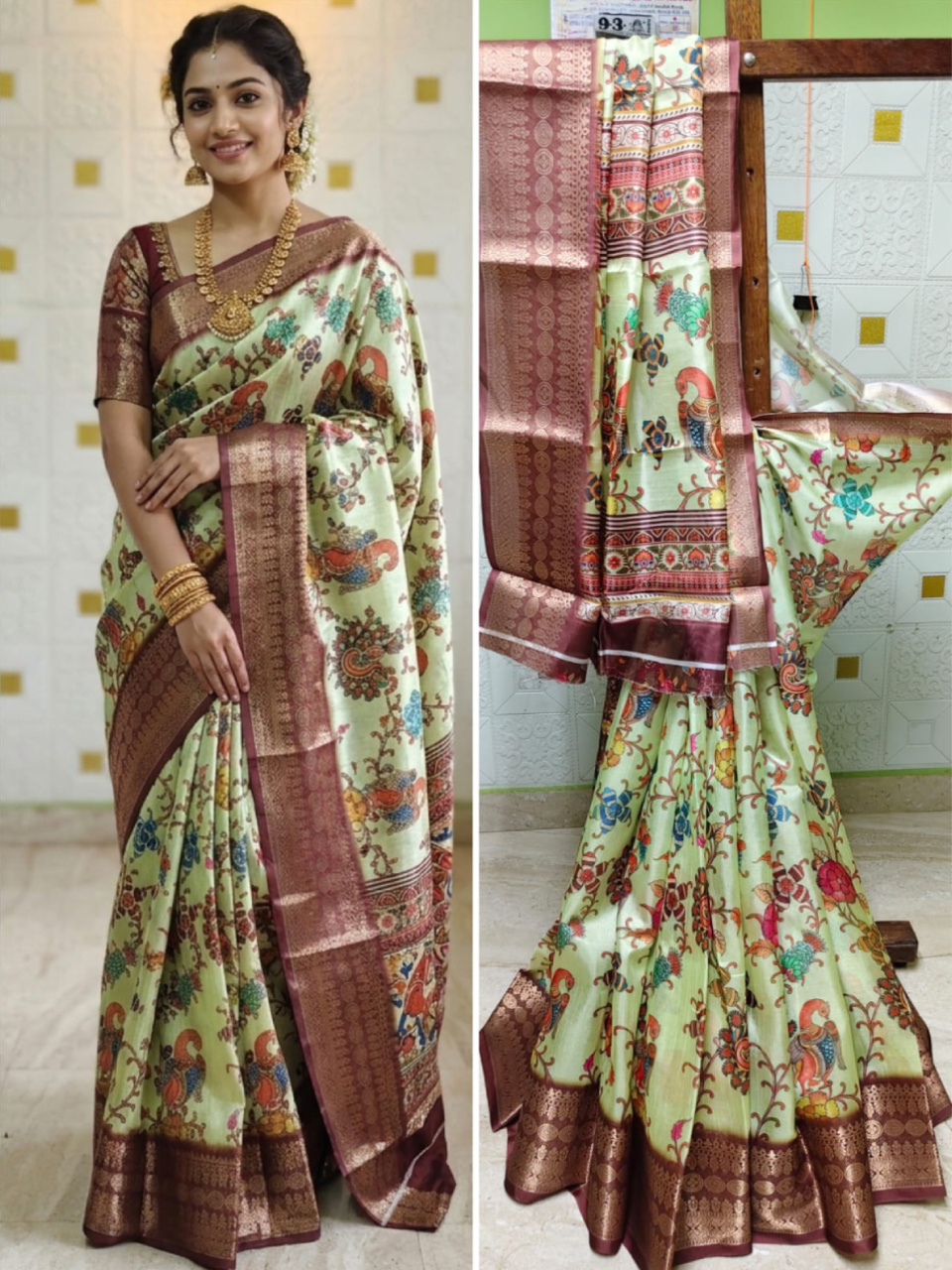 Copper brown zari borders on green silk saree.