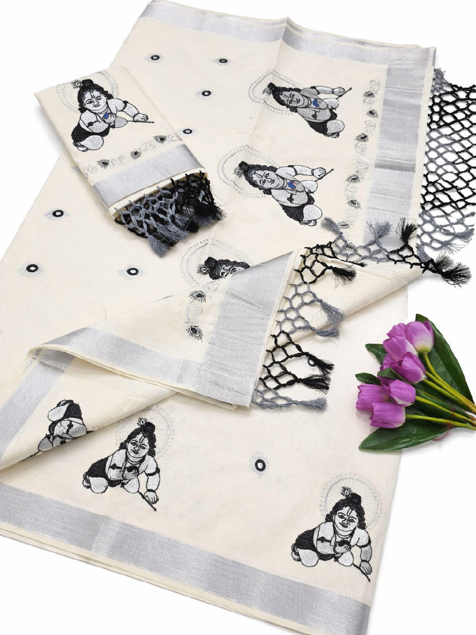 Experience the beauty of traditional Kerala craftsmanship with this Kerala Cotton Saree with Krishna Design from our Traditional Kasavu Collection. Made from 100% pure cotton, this elegant saree features exquisite Krishna embroidery motifs that symbolize devotion, culture, and timeless South Indian heritage.