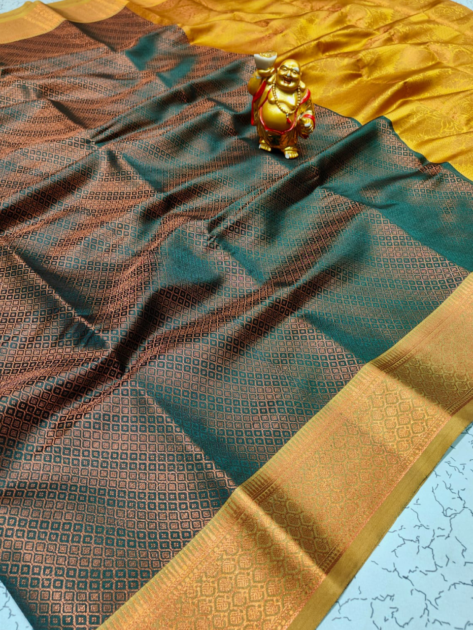 Kanchipuram Soft Silk Sarees are known for their luxurious texture, vibrant colors, and timeless traditional designs. Our collection features a Premium Kanchipuram Soft Silk Saree made with high-quality silk and fine copper zari work that gives a rich and elegant look.